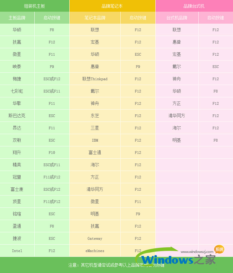 2、因为目前市面上主板类型丰富多样,启动热键也不尽相同。所以系统之家PE小编整理了各种品牌主板一键进入系统之家PE的启动热键,您可以在下面的列表中查找自己相应 的主板品牌,相信通过您查找的热键可以很方便的进入U盘PE主界面。