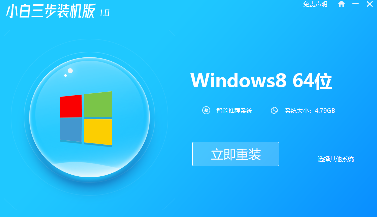 1.我们打开浏览器,搜索“小白”系统官网,点击下载三步装机版,下载后打开软件,选择win8.1系统,按下立即重装。