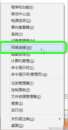1.按下Windows8.1桌面下的Win+X组合键,打开菜单设置选项,然后选择打开网络连接选项。