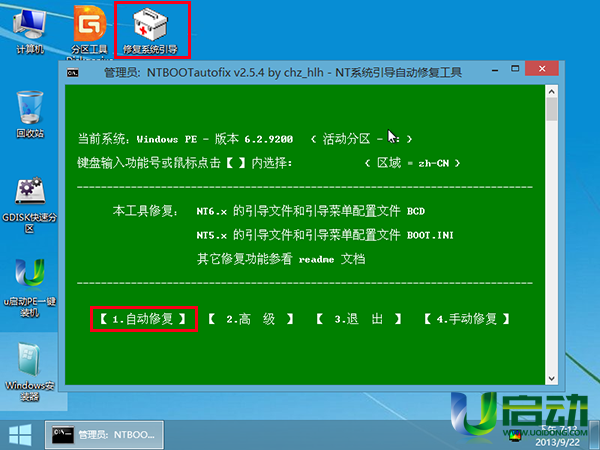 2、进入到u启动win8系统桌面后,双击打开“修复系统引导”工具,在弹出的窗口中点击“自动修复”选项,如下图所示: