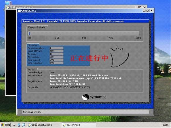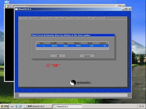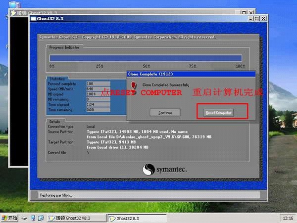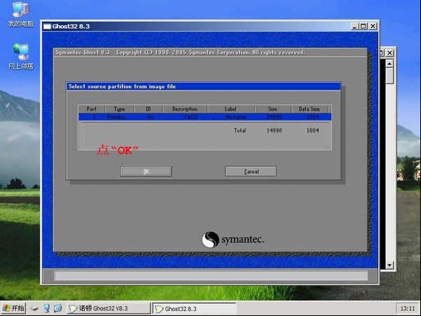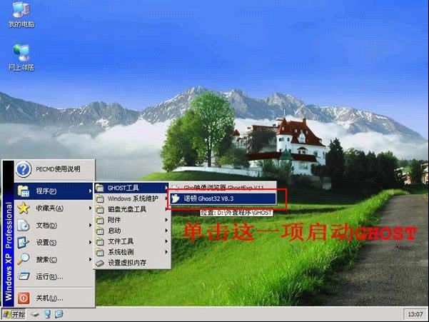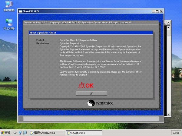在安装新的XP前,我们先对C盘进行格式化操作。进行XP光盘的安装。我们选择的是一个我们前面下载的GhostXP_sp3电脑公司快速装机版V13启动WinPe的Ghost,接着我们启动另外一个WinPE自带的软件诺顿Ghost。用它来把系统的ghost镜像恢复到之前被格式化的电脑的C盘里。