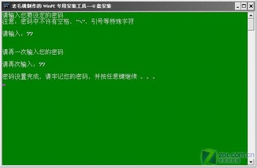 要给启动U盘设个密码,本来笔者不想设置启动U盘的密码,但这个步骤不能跳过,所以没办法只好设了一个密码。设置完后,一定要牢记你设好的密码,否则启动U盘会无法使用。  当你完成以上步骤后,恭喜,一个具有启动功能的U盘已经来到你的身边。你再也不用心烦没有光驱不能从光驱启动了,因为以后你可以从U盘启动再安装操作系统!