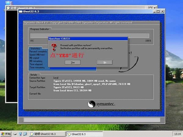 前面都选择好之后,会弹出一个对话框问你是否要将指定的GHO镜像恢复到电脑的C盘去,点击yes就可以。