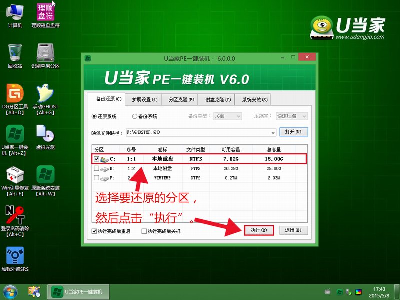 5、选择要还原的分区,一般默认的是C:盘。然后点击“执行”。