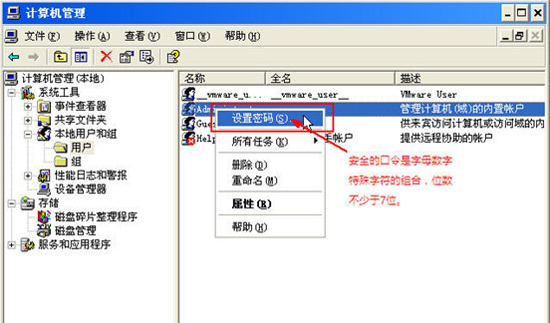 立即检查本机administrator组成员口令,一定放弃简单口令甚至空口令,安全的口令是字母、数字、特殊字符的组合,自己记得住,别让病毒猜到就行。修改方法:右键单击我的电脑--选择管理--浏览到本地用户和组--在右边的窗格中,选择具备管理员权限的用户名--单击右键--选择设置密码--输入新密码。