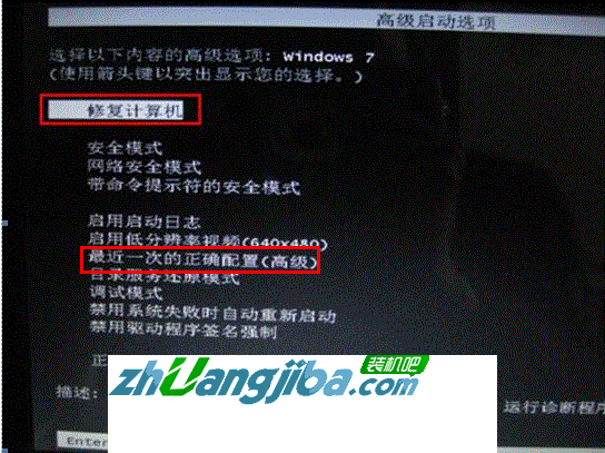 1. 开机连续敲击键盘“F8”按键,进入“系统高级选项菜单”,选择“最后一次正确配置”如下图: