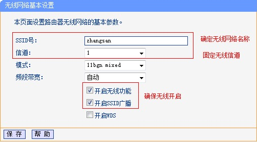1.在主路由器A的设置界面上,单击“无线设置”->“基本设置”->设置“ SSID号”,注意SSID不是中文->“通道”选择:1->检查“打开无线功能”,“打开SSID广播”->单击“保存”。