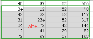 1、在Excel表格中找到需要求和的数据选中,然后按键盘上面的alt键+“=”号键。