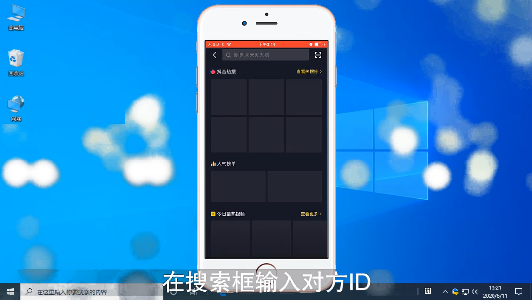 1、方法一,打开抖音,点击右上角的搜索图标,然后在搜索框里面输入好友的id进行查找。