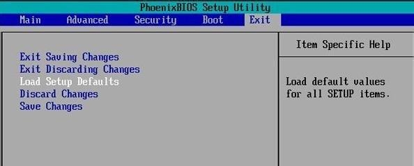 2.在[Exit]菜单下选择[Load Setup Defaults],然后按Enter。选择[是]后,再次按Enter。