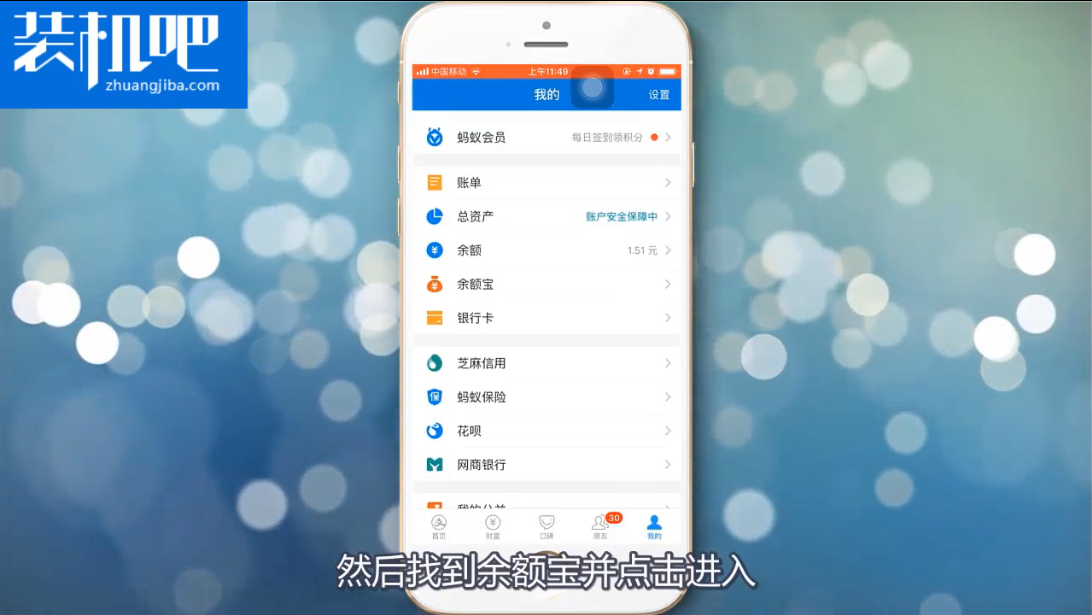 1、首先打开支付宝软件,然后点击右下角的我的,在这里点击进入余额宝。