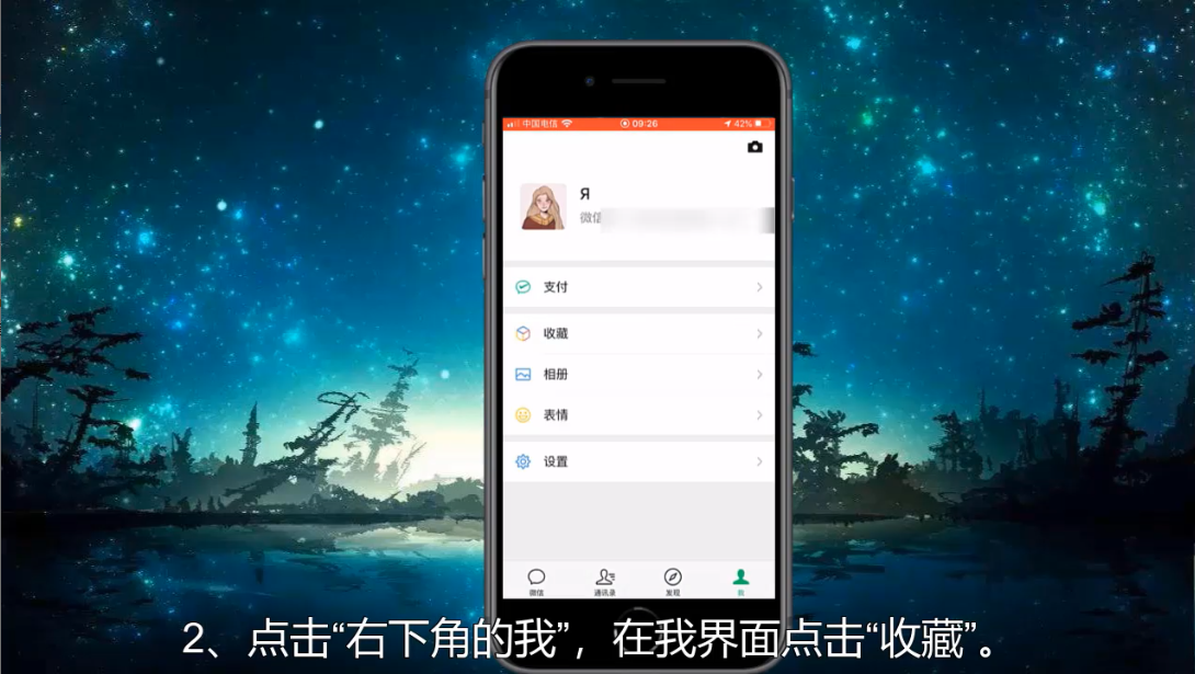 1、在手机找到微信并打开,在微信主界面点击右下角的“我”,然后点击“收藏”。