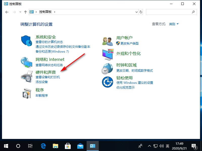 1、首先需要我们双击打开控制面板,选择“硬件和声音”。