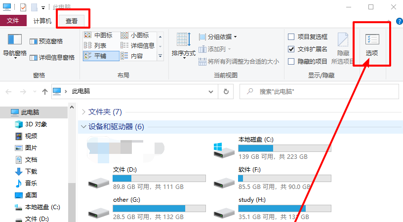 1、查看下文件是否被隐藏,打开u盘,点击上方的查看,然后点击选项即可。