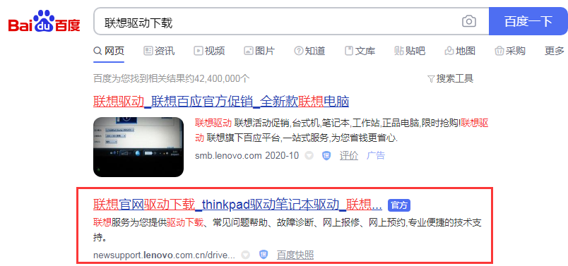 1、您可以百度搜索联想驱动官方下载,在给出的搜索结果中找到官方标签并打开。