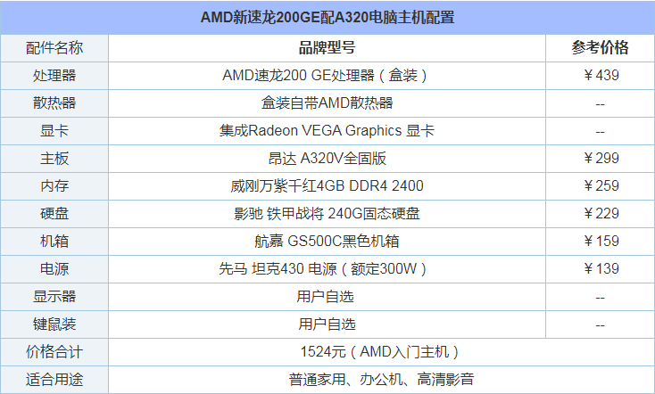 1、AMD新速龙200GE配A320电脑主机配置 - 1524 RMB: