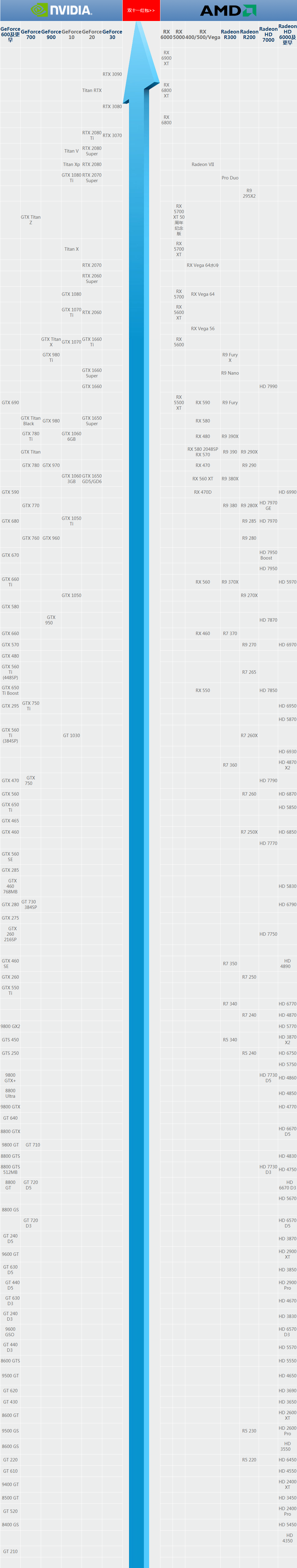 在当前的显卡排行榜中我们可以看到基于英伟达和 AMD 的显卡型号,当然这里可以看到越高排名它的性能说明则越好。而在高配置的同时它的价格也越高,所以,一般情况下我们要根据自己的实际情况来选择适合自己的产品。