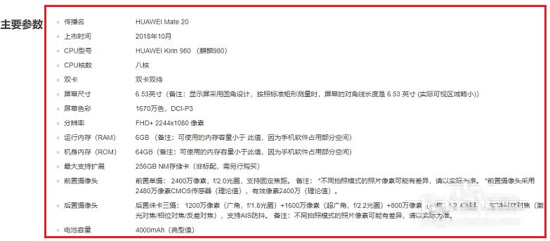 1、我们可以看到华为mate20双卡双待,屏幕6.53英寸,摄像头前置单摄2400万像素,后置徕卡三摄 1200万像素,CPU型号麒麟980,运行内存6G。