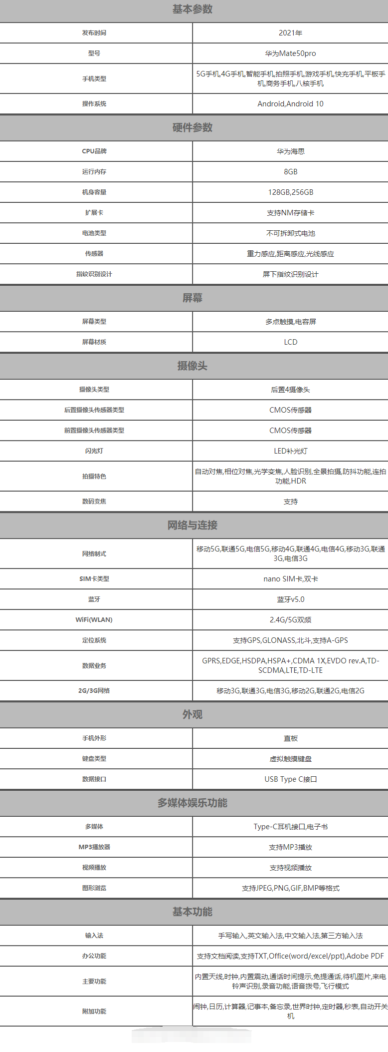 华为mate50pro 参数配置详细介绍: