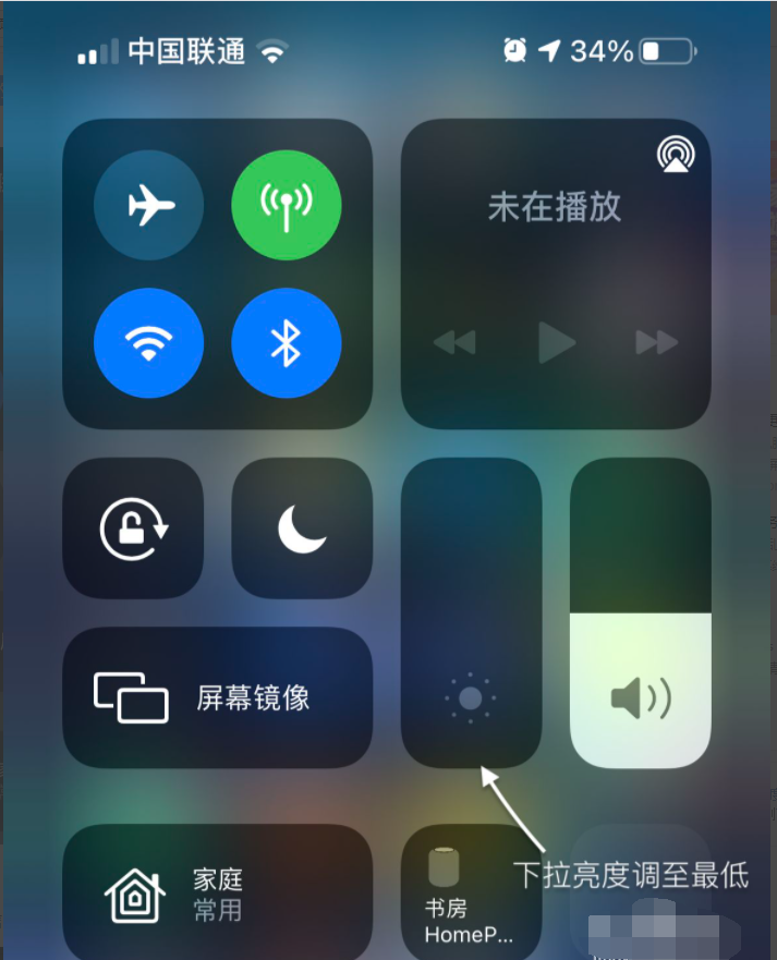 1、首先请把苹果12的高度调到最低。从右上角往下滑动调出控制中心,然后把屏幕亮度调到最低。