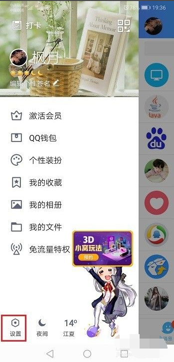 1、首先我们要登录一个可以正常登录的账号,登录之后,我们向右滑动屏幕,在菜单栏的左下角点击打开“设置”。