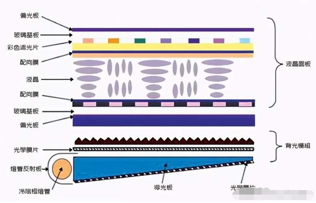 假设屏幕只有背光源和偏光片,已知上、下偏光片位置是呈90°的,这时候背光源发出的光源就无法透出屏幕,因此屏幕会呈现黑色。也就是说想要显示白色,下偏光片发射的光源必须与上偏光片方向平行才可以,这时液晶层的作用就出现了。