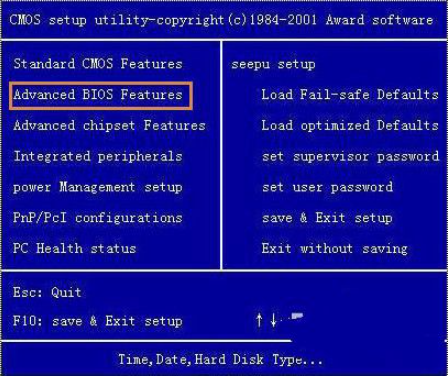 2、进入BIOS设置后选择“Advanced BIOS Features ”。