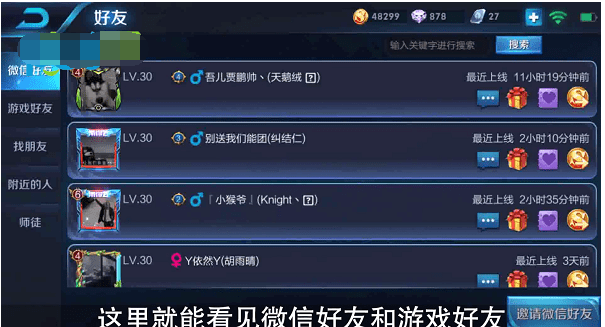1、其实很简单,在游戏主页面点击好友图标,这里就能看见微信好友和游戏好友以及附近的人最近上线时间了。