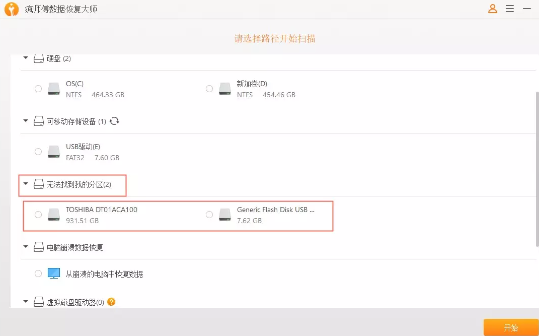 1、下载安装疯师傅数据恢复大师,打开软件,进入界面,如图,点击【无法找到我的分区】,选择任意一个驱动,点击【开始】。
