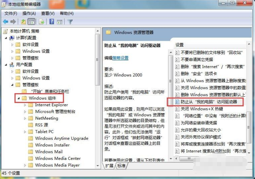 2、在弹出的窗口里,按顺序打开:用户配置→管理模板→Windows组件→Windows资源管理器,在右侧找到并打开防止从“我的电脑” 访问驱动器。