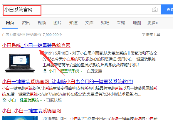 1,首先,打开百度搜索“小白系统官网”到官网内下小白一键重装系统软件,并将u盘插入电脑的USB插口处。