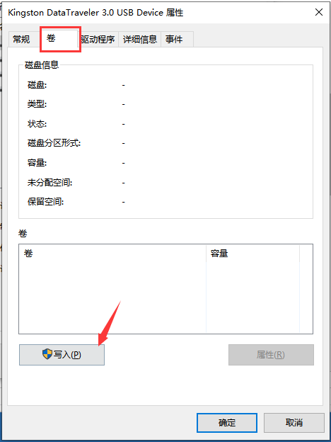 4、找到顶部的【卷】选项栏,下方选择【写入】选项。