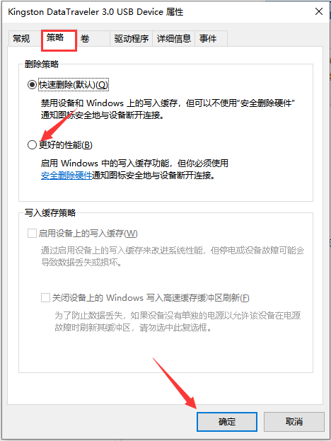 5、然后选择【策略】选项栏,选择【更好的性能】,单击【确定】即可。这样U盘写保护就解除了。