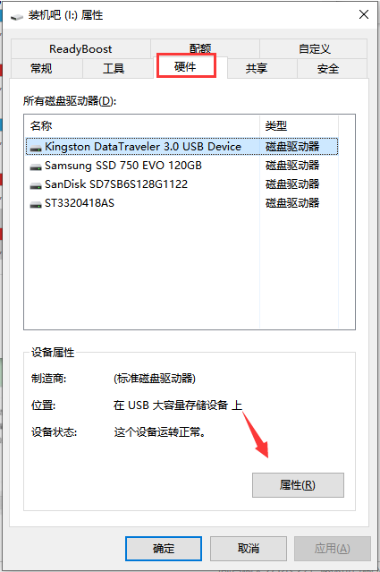 3、出现的属性窗口切换到【硬件】选项栏,点击【属性】。