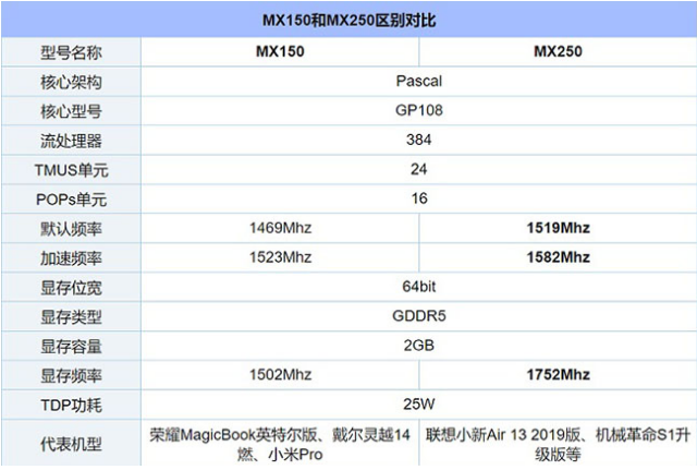 2、移动版的 GeForce GTX 1050 与桌面版拥有相同的 CUDA 核心数量,两者的差异在于频率,因此可以说GTX1050笔记本性能与桌面显卡没啥区别。那么这样就好区分了,MX250作为马甲卡,完全可以参考上一代MX150性能,这张显卡规格与桌面卡GT1030相同,主要也是频率差别。