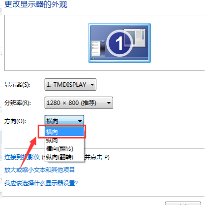 5、进入更改显示器的外观界面找打“方向”按钮并设置显示器为横向;