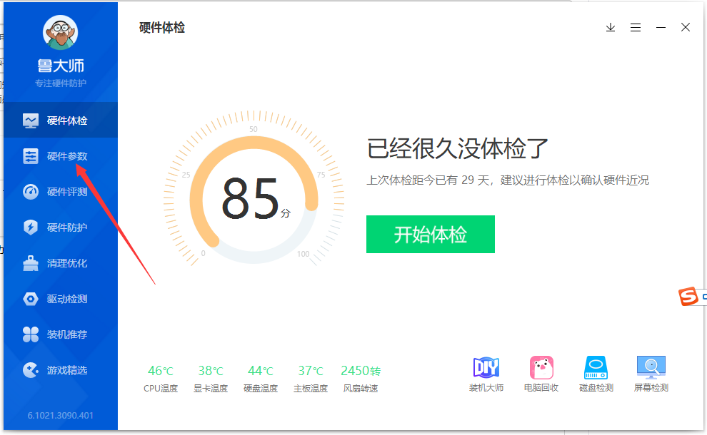 2、打开“鲁大师”,然后点击硬件参数选项卡。