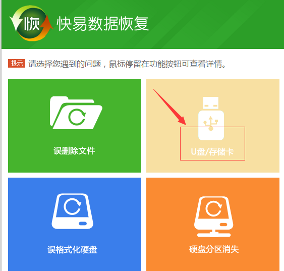 1、打开快易数据恢复软件,在主界面上点击“u盘/存储卡”。