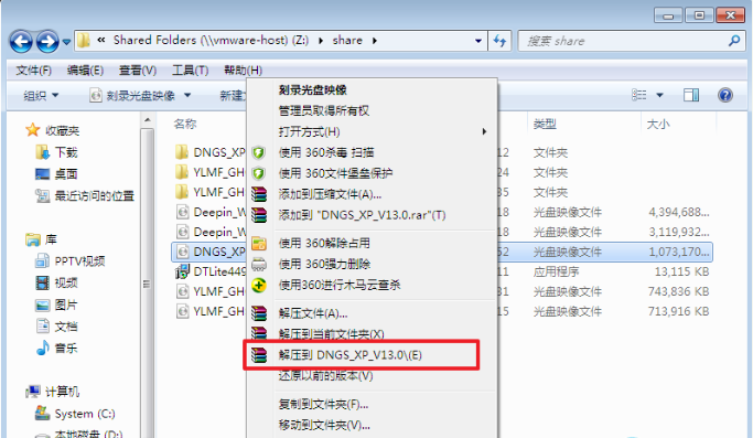 1、将下载来的xp系统iso镜像文件解压,选中—鼠标右键—在右键菜单栏中选择“解压到DNGS_XP_V13.0",如图1所示:
