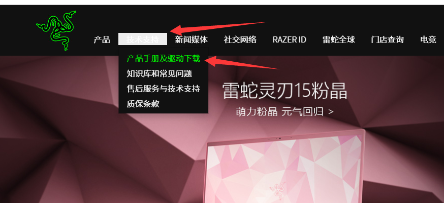 1、首先下载雷蛇驱动,进入雷蛇官网,点击技术支持下方的产品手册及驱动下载。
