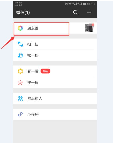 1、在微信主界面,单击“发现“然后在点击”朋友圈“命令。