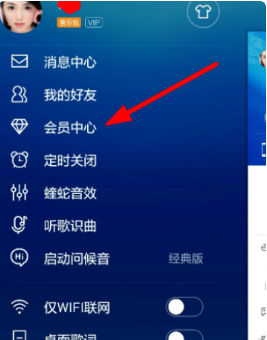 一、首先打开酷狗手机客户端,左滑进入个人中心,选择第三项“会员中心”。