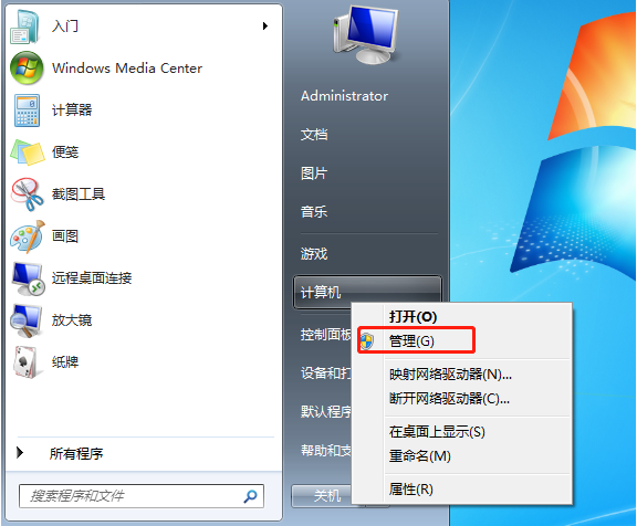 1、我们首先打开电脑,在电脑的左下角打开开始菜单栏,找到计算机右键选择管理选项打开。