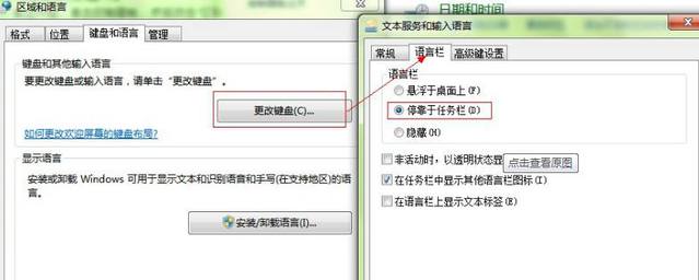 打开控制面板,选择“时钟、语言和区域——区域语言——更改键盘或其他输入法”,点击“更改键盘”按钮后,在“语言栏”中选择“停靠于任务栏”就可以啦。