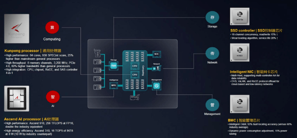 华为推出的鲲鹏920以及基于鲲鹏920的TaiShan服务器和华为云服务。鲲鹏920采用7nm制造工艺。规格方面,支持64内核,主频可达2.6GHz,集成8通道DDR4,支持PCIe4.0及CCIX接口,可提供640Gbps总带宽。鲲鹏920主打低功耗、强性能,在典型主频下,SPECint Benchmark评分超过930,超出业界标杆25%,同时,能效比优于业界标杆30%。