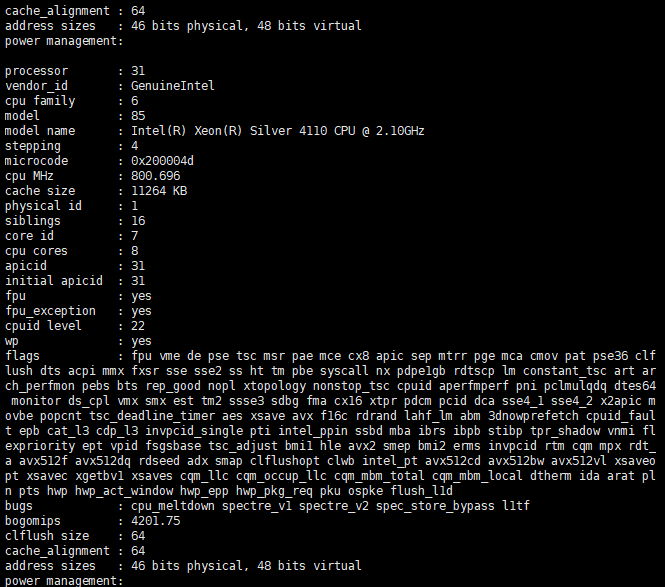实际上对于cpu的描述应该更详细一些。这个机器是虚拟机,我们看一下物理机的更详细的信息。 其中: