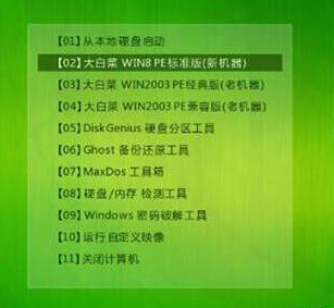 1、进入到大白菜主菜单,选取【02】大白菜win8 pe标准版(新机器)选项,按下回车键确认。