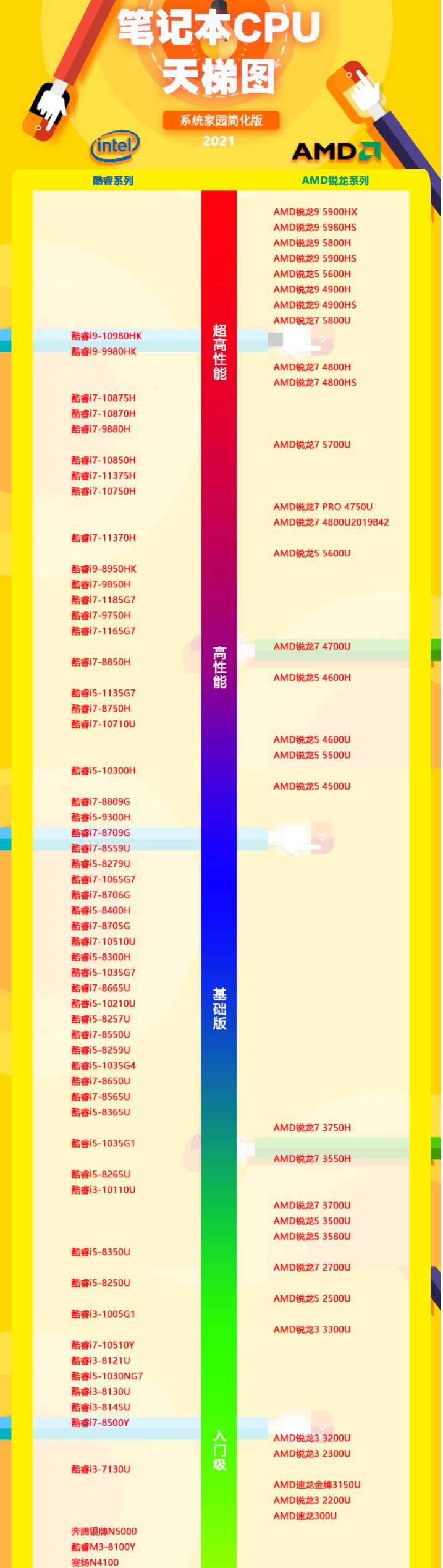 笔记本cpu排行榜天梯图2021新版如下: