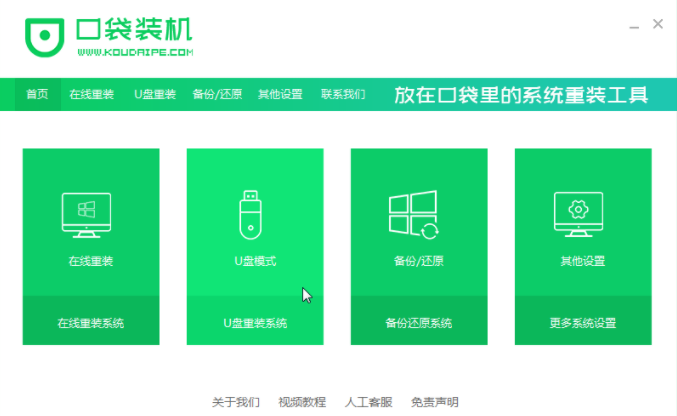 1、首先我们在桌面上打开口袋装机软件,在页面中选择U盘重装系统。