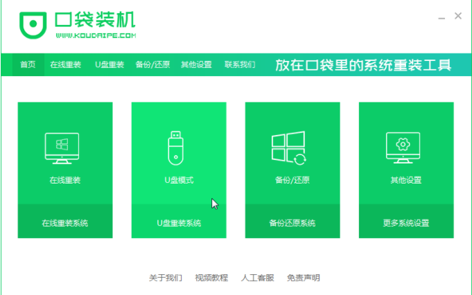 1、首先我们打开口袋装机软件,在打开的页面中选择U盘重装系统功能。